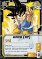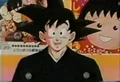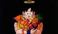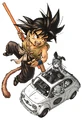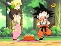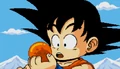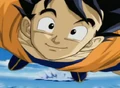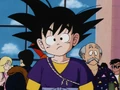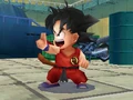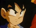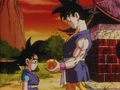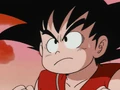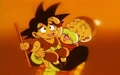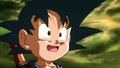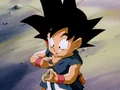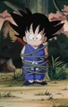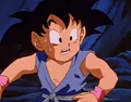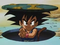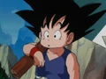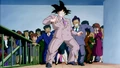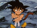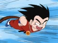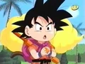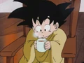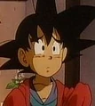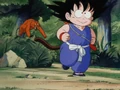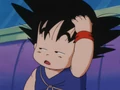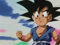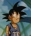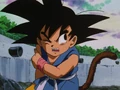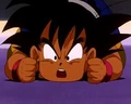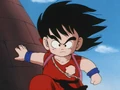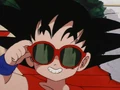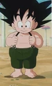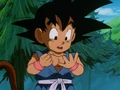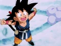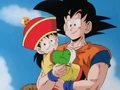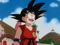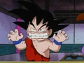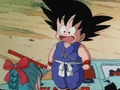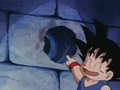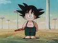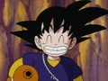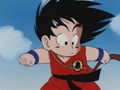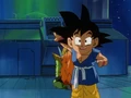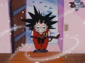 Meanwhile, Goku notices the ship being dragged away by Don Kee's men. He tries to use Instant Transmission to teleport them to the ship, but after two failed attempts, he realizes that he can not use it with his small body. They are forced to travel to Don Kee's palace on foot to recover their ship. Pan decides that they will use a stealth operation to recover the ship and would only result to fighting as a last resort. After briefly sneaking around a large rock falls on Trunks' head and Giru starts making noises that alarm the guards. The guards open fire on Goku and the others and Pan says that they must fight now, so Goku agrees. Pan jumps in the carrying car while Goku moves the ship onto the car and Pan drives the ship out of the palace with Goku and Trunks. But while escaping, Don Kee's henchmen Gale and Sheila fire a ki blast at Goku who reflects it back with ease towards Ledgic, Don Kee's right hand man who recognizes them as Saiyans. Goku and the others escape but Trunks says they have to go back into town for more parts due to Pan's "reckless driving". Goku in child form during Dragon Ball GT