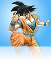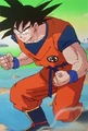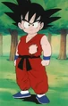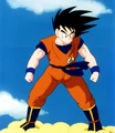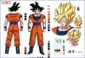 Goku is the main character of the entire Dragon Ball series. He has spiky black hair that never changes throughout the franchise. He is most commonly seen wearing his trademark orange/red/golden gi over a dark blue undershirt. The gi has featured Master Roshi's, Kami's, and King Kai's kanji on its left side (over the heart). It is also featured on the back. After the Frieza Saga, no symbols appear and Goku's gi turns a darker orange. He wears dark blue wristbands, along with dark blue boots that are outfitted with yellow/beige laces. As a kid, he has a tail due to his Saiyan heritage and also wields the Power Pole. Akira Toriyama's first draft of Goku