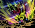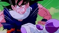 Goku's body, worn out and beaten, uses a Medical Machine inside Frieza's spaceship taking several hours to heal.[140] When he emerges, once again it is to join a battle in progress, where Vegeta meets his doom against Frieza.[141] The battle against Frieza is furious, as he seems to be invincible. Even Goku's most powerful attack, the Large Spirit Bomb, fails to kill Frieza.[142] However, when Frieza kills Krillin and critically injures Piccolo (who had been resurrected and was transported to Namek to help), Goku, in anger, taps into his inner power reserves and transforms into a Super Saiyan.[142] He eventually battles Frieza and dominates him. In desperation, Frieza uses the Homing Destructo Disk technique, creating two pink Destructo Disks and throwing them at Goku. Goku moves too quickly for the attack, and maneuvers himself so that Frieza is in between him and the disks. Goku yells a warning to Frieza, but Frieza is too slow and is cut in half, losing an arm in addition to his legs. The weak tyrant begs Goku to help him. Goku, believing that Frieza does not deserve to be forgiven or spared, gives him some of his energy as a show of mercy. Bitter at his defeat, Frieza uses it to launch a powerful energy wave at Goku. Goku notices the blast and fires an Angry Kamehameha at Frieza, defeating him. The final battle on Planet Namek between Super Saiyan Goku and 100% Power Final Form Frieza