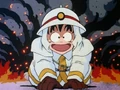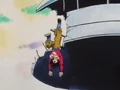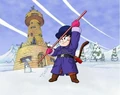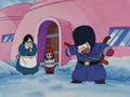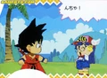 Goku ends up chasing General Blue to Gengoro Island, where he crashes in a strange town named Penguin Village.[73] While there Goku meets Arale Norimaki and the Gatchans who try to help Goku look for General Blue and the Dragon Balls. Arale introduces Goku to Taro and Akane who seemed interested in his flying nimbus. Goku searched through Penguin Village and asked many of the residents if they have seen General Blue. Arale takes Goku to her house to have Senbei fix his radar. While at the Norimaki house General Blue shows up to steal Senbei's plane and fights Goku again. While using his telekinesis again on Goku, Arale surprises Goku by easily defeating him and headbutts General Blue far away. While Goku got his Dragon Balls back he got his Dragon Radar stolen by Blue. Senbei's son, Turbo uses his powers to create him a new one with parts from Senbei's plane so he can continue his quest.[74] Goku does battle with Mercenary Tao