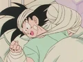 After the battle with Vegeta, Goku is severely injured, and Korin is out of Senzu Beans, so Goku has to stay behind in Wukong Hospital with Chi-Chi while Gohan, Krillin and Bulma go to planet Namek to find the Namekian Dragon Balls in order to revive their fallen friends.[133] After a few weeks, Korin grows a new batch of beans and sends Yajirobe to give one to Goku, which heals him completely. Goku then uses Dr. Brief's new spaceship, which he constructed from Goku's original Saiyan pod, to go to Namek.[134] Goku in Captain Ginyu's body, struggling to stay alive