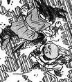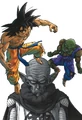 Goku returns three years later at the age of 18, to meet up with his friends and join the tournament and grown into a young man that no one recognizes.[111] In the preliminaries, Goku is put up against King Chappa, who wants to avenge his loss from three years prior, but fails again.[112] In the quarterfinals Goku is matched up against an unknown female fighter who seems to know who Goku is, and knows the fighting style that Master Roshi teaches. After Goku defeats her, she reveals herself to be Chi-Chi, whom Goku had unknowingly promised to marry years before thinking marriage was a type of food. Before leaving the ring, Goku asks for her hand in marriage.[113] Goku attacking Piccolo