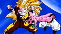 Upon awakening, Goku could sense neither Vegeta nor Gohan anywhere and comes to the conclusion that they have been killed in the battle (when actually Gohan was narrowly saved by the badly injured Supreme Kai, and only Vegeta died in a vain attempt to try and eradicate Majin Buu). He heads to Kami's Lookout and is healed by Dende, who confirms that Vegeta sacrificed himself in an attempt to destroy Majin Buu. After transporting everyone to the Lookout, he tells the bad news to them. With the little time he has left on Earth, with the help of Piccolo, he decides to teach Trunks and Goten the Fusion Dance, which he learned from Metamorans while in Other World, so they may form one immensely powerful being that might stand a chance against Majin Buu. Super Saiyan 3 Goku dominates Majin Buu in battle