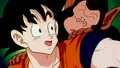 Three days later, Goku and Bulma end up in Aru Village, which is under control by an evil shape shifter named Oolong, who kidnaps the villagers' daughters.[38] After Goku fails to impersonate Pochawompa in an attempt to find the location of Oolong's hideout, he decides to face Oolong head on. After chasing him outside the village, Goku manages to capture him, forcing Oolong to give the villagers back their daughters. Afterward, they are rewarded the six star Dragon Ball and Oolong is forced to join Goku and Bulma on their quest.[39] While crossing the Diablo Desert on their way to Fire Mountain, Goku fights a bandit named Yamcha, who is friends with a former classmate of Oolong, named Puar.[40] Goku and Yamcha have a duel, and Yamcha is surprised when Goku brings out his Power Pole, learning that he is the grandson of the legendary martial artist, Gohan. After nearly losing to Yamcha's Wolf Fang Fist due to hunger, Bulma awakens, causing Yamcha to flee due to of his fear of women. Later that night, Goku and the others stay the night in Oolong's House-Wagon, where Goku tells Oolong about the Dragon Balls while Yamcha and Puar hide outside and listen, also learning of the mystical spheres.[41] The next morning, Goku fights Yamcha again after he destroys the House-Wagon and attempts to rob them. Goku knocks out his opponent's tooth and Yamcha, in a false display of apology, gives them a car that secretly has a tracking device for him to follow them.[42] Goku's first use of the Kamehameha after seeing Master Roshi use it